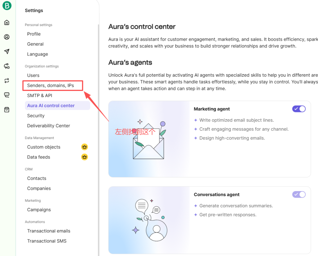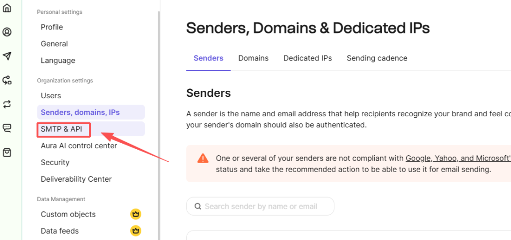 - 登录Brevo账户,进入”Senders & IPs” → “Senders”部分