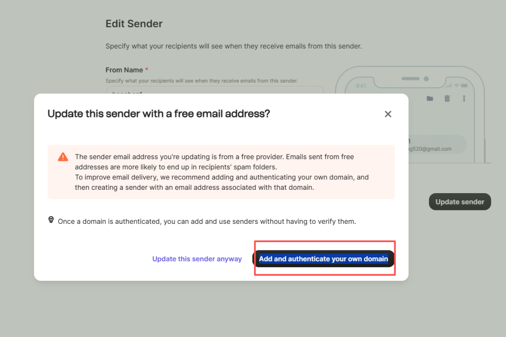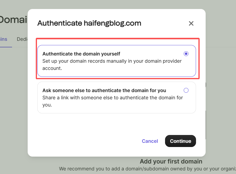 - 然后在弹出的窗口中选择“Add and authenticate your own domain”