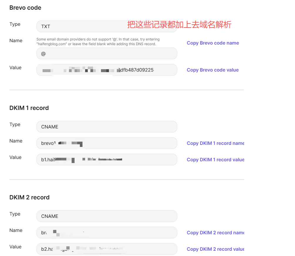 像Brevo、Mailgun这些邮件程序,虽然官方明确说只是适用于任何电子邮件,包括免费和付费,但是实际上,想要使用免费邮箱(诸如QQ、163、微软、谷歌,反正这四个我都尝试了不行)成功配置是很难的,Brevo实际上还是要强制绑定域名才能够成功发送邮件,添加记录。